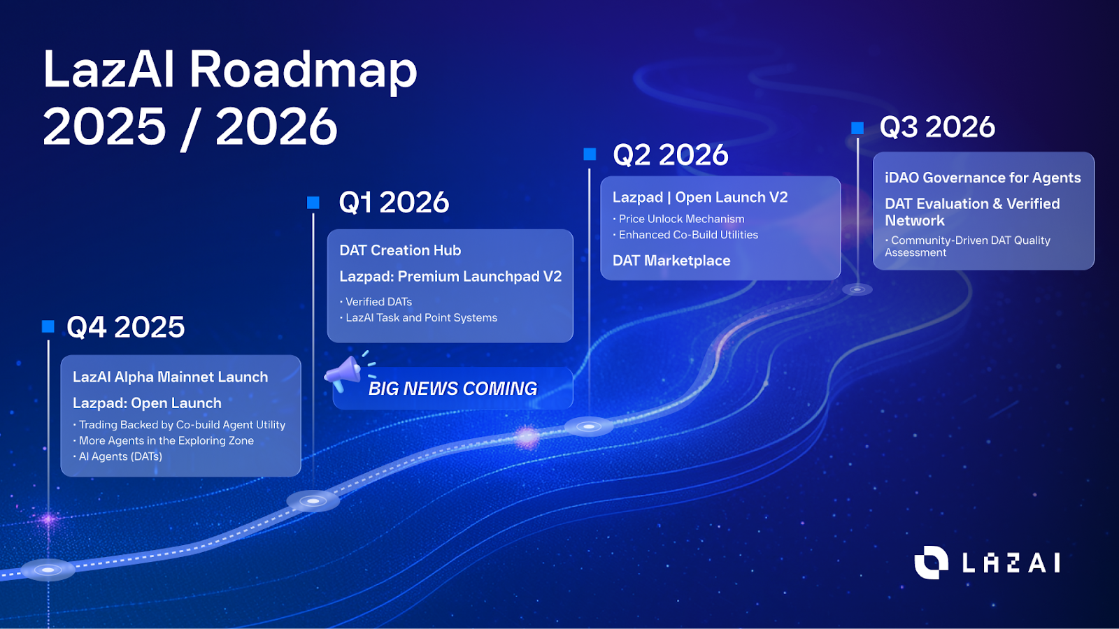 Throughout 2025, LazAI has been expanding its high-performance AI data layer. Phase One introduces Alith, the AI agent framework for decentralized data processing. Later stages bring the DAT-based economy, PoS + QBFT consensus, and iDAO arbitration.