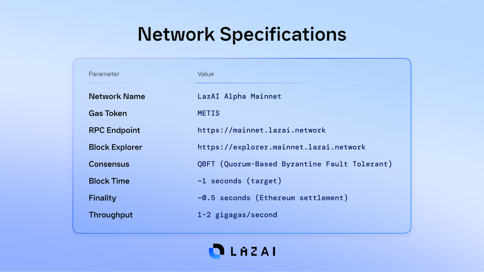 Developers can now deploy production-ready Dapps and AI Agents directly on LazAI. The Alpha Mainnet supports QBFT consensus with one-second block times and half-second finality anchored to Ethereum.