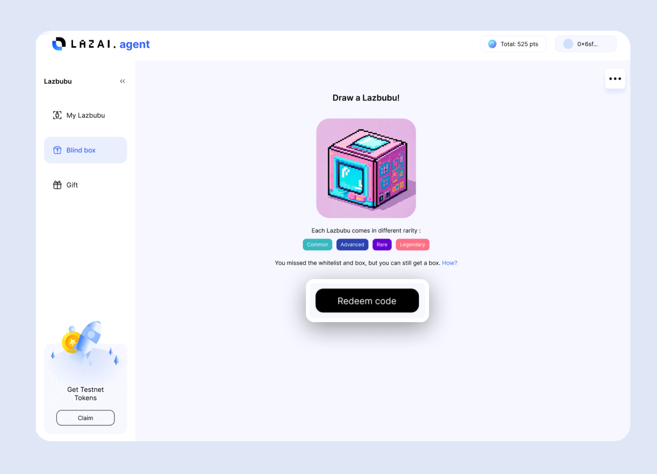 Open your blind box to meet your Lazbubu. Each Lazbubu has a rarity level: Common, Advanced, Rare, and Legendary. The rarer your Lazbubu, the greater the rewards it can bring, and the faster it will mature.